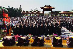 虔敬、欢喜的气氛笼罩整个佛光山。随后,所有与会信众转往佛陀纪念馆参加信徒大会,信众虔诚合掌恭迎星云大师抵达会场,心培和尚、心定和尚、慧得法师、慧昭法师、慧龙法师、慧宽法师等六大师及16位信徒代表尾随在大师后方入场,并沿路散花,一时之间,花雨满天,现场气氛热到最高点。