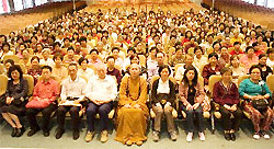 心培和尚(中)与大家慈悲开示后,在檀信楼大礼堂内与大家欢喜合影。