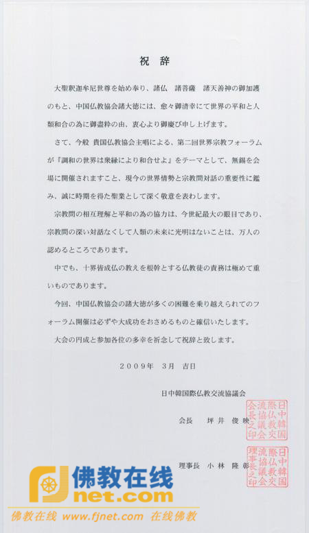 近日,日本“日中韩国际佛教交流协议会”致函祝贺“第二届世界佛教论坛”即将举行,贺信原文如下: