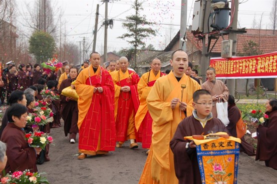 在玉田寺筹委会主任悟忍法师的亲自引领并四众弟子们的跪地散花虔诚迎请下,来自新加坡、香港、北京、广东、福建、江西、湖南及湖北本省各市的高僧大德庄严的步入会场。