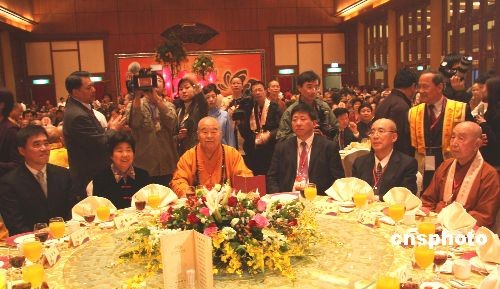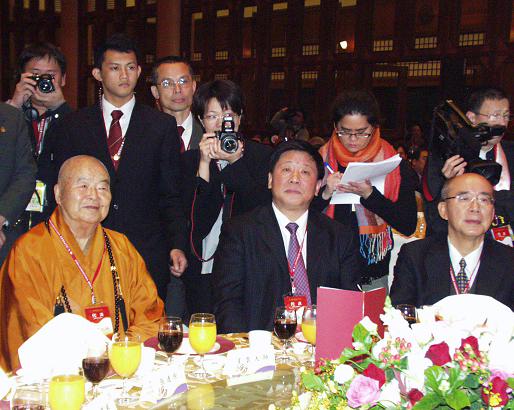 台湾佛教界在台北圆山大饭店十二楼举行盛大欢迎晚宴,国家宗教局局长叶小文、中国国民党主席吴伯雄、香港民政局长曾德成、江苏省政协主席张连珍、台北市市长郝龙斌、 中国佛教协会会长一诚法师,台湾国际佛光会创办人星云法师,香港佛教联合会会长觉光法师等应邀在主桌就座。
