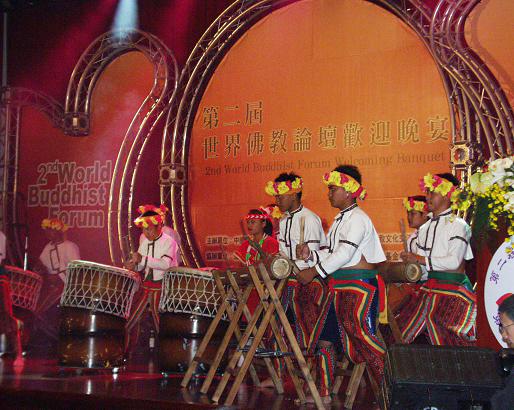 | 图为台湾少数民族在欢迎晚宴上跳起台湾的表演者为来宾演出了原住民舞蹈、海之女。,欢迎参与佛事盛会的各界嘉宾。 |