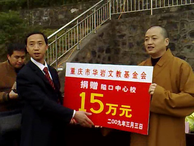 捐赠仪式上秀山县政府陈副院长代表秀山县领导班子发言,感谢重庆市华岩文教基金会对秀山县教育事业发展的帮助和支持,并保证将捐款用到实处,建好希望小学,不辜负道坚法师和重庆市民宗委洪道元主任的关心和支持。