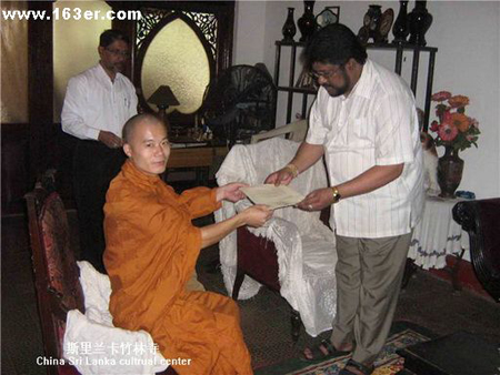 斯里兰卡竹林寺、中斯文化交流中心创建者延印法师向斯里兰卡宗教事务部部长Pandu Bandaranayake对于委任斯里兰卡宗教事务部顾问表达了真诚的谢意。延印法师表示中斯友好历史悠久,文化、宗教等领域交往源远流长,个人愿意尽最大努力而促进中斯两国人民的传统友谊和扩大中斯两国的文化友好往来。