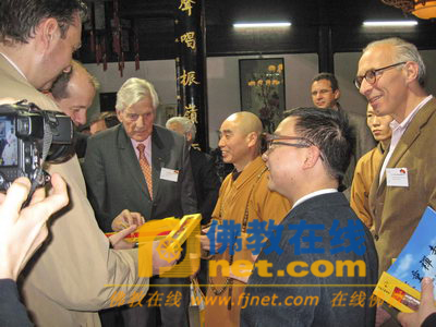 2009年4月6日下午,德国大西洋桥组织基辅主席一行二十多人到浙江省宁波市天童禅寺参观,并拜会天童禅寺方丈诚信法师。诚信法师在大鉴堂接待了基辅主席一行,宾主双方进行愉快地交流。