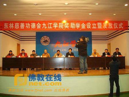 2009年4月1日,东林慈善功德会九江学院奖助学金设立暨发放仪式在九江学院举行。九江市副市长卢天锡、市民宗局局长朱晓林、九江学院党委书记陈绵水、院长甘筱青,庐山东林寺代住持大安法师、东林慈善功德会会长镜义法师等出席了仪式。150位学生代表参加了颁发仪式,其中优秀生20名,奖学金每人3000元;特困生50名,助学金每人2000元;贫困生100名,助学金每人1000元。
