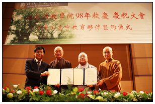 2009年4月8日上午九点,法鼓佛教学院在该校国际会议厅隆重举行校庆典礼,法鼓佛教学院校长惠敏法师与东山高中陈佳源校长,签署了《教育伙伴关系合约书》,在法鼓山方丈果东法师、东山高中董事长悟圆法师和百余位贵宾的共同见证下,两校将朝向强化佛教研修宽度与深度的目标携手迈进。