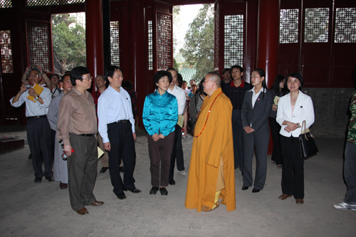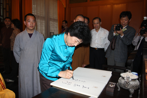 在永信法师的陪同下,王志珍副主席参观了少林寺的殿堂、碑刻等古迹,在方丈室前少林寺的僧人为王志珍副主席展示了精彩的少林功夫,王志珍副主席赞扬了僧人的功夫,并和僧人们亲切握手合影留念。随后在方丈室,永信法师向王志珍副主席介绍了少林寺的历史以及少林寺利用现代科技成果研究传承少林文化的情况。王志珍副主席表示,“中国的传统宗教里面蕴涵了许多艺术、哲学的精华,而少林寺对这些艺术、哲学的发展和传承做出了巨大的贡献。”