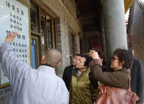 时逢民盟参政议政工作会议于4月13日至14日在太原召开,五台山今天迎来一批不同的客人——无党派人士,他们多是从事文化教育以及科学技术工作的高、中级知识分子,普寿寺当家隆严法师及其助理寂文法师、知客妙一法师给予了热情接待。由普寿寺新山门开始,经五观堂一路讲解,走到法堂时正是师父们每天诵《华严经》的时间,他们非常好奇地问了很多问题,比如诵经的师父们年龄啦、穿着怎么和你们不一样啦等等。