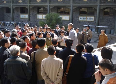 在阅览室藏经楼,寂文法师梗概地为大家讲述了普寿寺自1991年扩建至今,由105元开始自己动手兴建寺庙,培养僧才的历程。并在大家的关心下,详细地介绍了普寿寺三加一僧伽教育工程的情况。然后,在簇拥下进入了普寿寺的旧院——戒学部,这是完成尼众六年律学基础教育的重要部门,也是普寿寺最早的基地。当大家看到师父们井然有序的寮房陈设、叠得如豆腐块似的被子、整齐的经书等等,都非常赞叹。