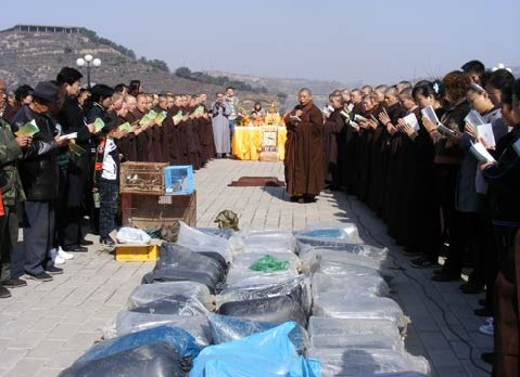 从晋中、太原以及周围各市县纷至沓来的数百名男女老幼,将还在朦胧中的龙栖湖唤醒了。不是因为向往它的美景,而是来参加普寿寺三加一僧伽教育工程之一“菩提爱心协会”举办的放生法会。湖畔上摆放着数十筐各类水陆飞行的众生,它们都是“菩提爱心协会”的会员们为了避免商贩提前捞捕,于今天凌晨现购的。看到它们在狭窄的空间里穿梭蠕动、扑撞腾跃,人们悲悯之心油然而生,真觉得这些小生灵可怜更甚可爱,它们也和人一样渴望自由。于是不断的有师父和居士围上来为它们念三归、佛号。