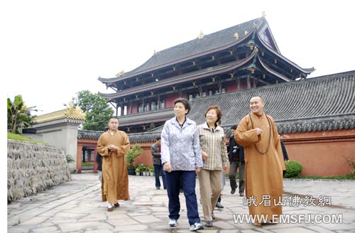 2009年4月5日,原四川省政协主席秦玉琴和四川省委常委、省总工会主席李登菊一行在乐山市市长蒋辅义、副市长周勇、峨眉山——乐山大佛风景区管委会宗教局局长李黔等的陪同下,先后参观了峨眉山大佛禅院和峨眉山报国寺,并就峨眉山佛教文化建设情况进行调研指导。峨眉山佛教协会会长永寿法师、大佛禅院监院常性法师、报国寺监院昌明法师等热情接待。