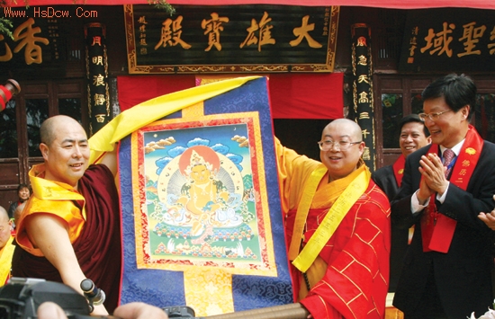 昨日上午,东方山弘化禅寺举行盛大庆祝仪式,纪念建寺1200周年。庆典大会在该寺大雄宝殿前举行,杭州灵隐寺方丈光泉法师等各地高僧、各地佛教协会负责人等100多位贵宾参加了庆典,1000多名僧人及香客观摩了这一盛会。湖北省省委统战部副部长、省民宗委主任谭徽在,王建鸣、郭远东等市领导也出席了当天的庆典。图为河北承德普宁寺方丈代林法师向弘化禅寺赠送唐卡。