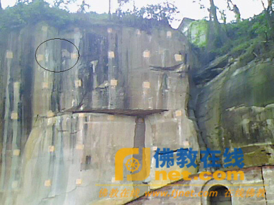 网友“二月天”发帖称,在大佛寺景区内,从石蹬琴声出发,至海潮音方向约50米处的岩壁上,有一前一后两个人头像清晰可见。头像距地面高约15米左右,均为侧影。从图片可看出,左边一个头像头发自然下垂。右边一个头像头戴高帽,皮肤黝黑,如同古代官员。
