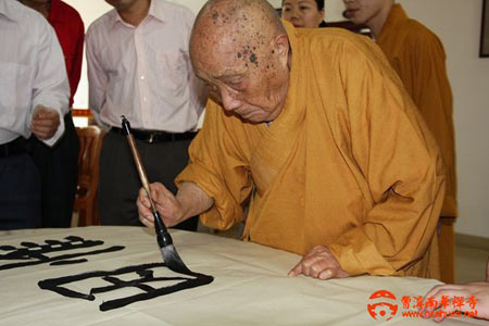 最后,应传正法师的邀请,本焕长老即席挥毫,题下“惟因知果”四个大字。