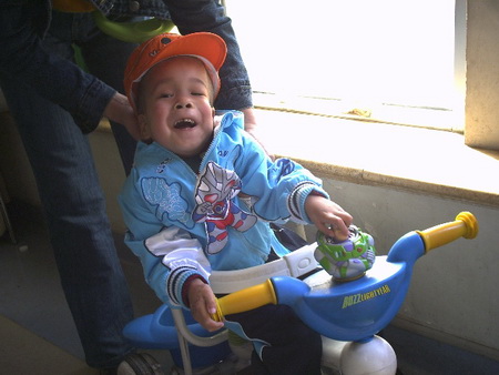 换上志愿者叔叔阿姨们买来的新衣服精神头十足,兴致勃勃地坐在捐送给他的小推车上让大家给他照相。很少开口讲话的他因为闪关灯乱闪,小小埋怨的一句“我还没有笑呢”顿时惹得全场大笑,“小明星现在还真是派头不小啊!”大家开心的逗着战成。