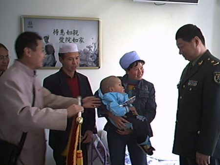 一面锦旗感谢入院以来西京医院医护人员精心的护理,当东林慈善功德会陕西联络处左晓洲代表东林慈善功德会陕西联络处代表小战成家长赠神经外科主任费周教舟给手术,在场所有志愿者用尊敬感激的眼神默默的注视着,没有更好的语言表达,只有热烈的掌声。