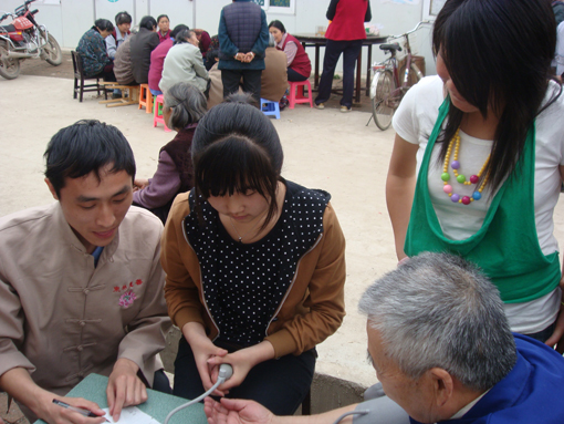 为维持义诊秩序及配合医护人员工作,武汉志愿者高丽阳连同小区两位义工小女孩为村民量血压,西安志愿者张涛、宁波志愿者王雪飞分别于内科、理疗义诊室门口为看病者编号及控制进出,苏州志愿者陆丽红于内科义诊室内发药及说明用法用量,九江志愿者武见萍于输液室看护病人。义诊三天中,很多外乡的人也闻讯赶来,医护人员超负荷工作,义诊人次约600。药品采购三次。