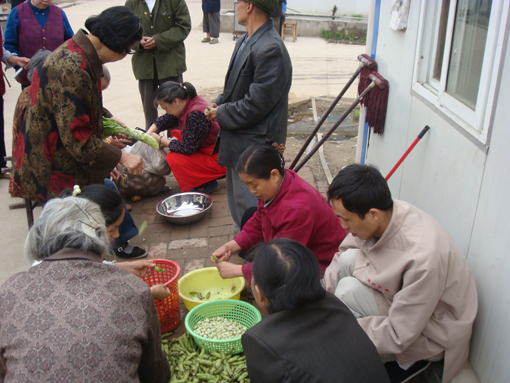 受到感动的村民为东林慈善后勤组剥花生、择菜、搭衣架,做各种杂物.