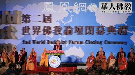 主办方代表吴伯雄在闭幕式上致辞,他说:“在第二届世界佛教论坛闭幕式发言是我一生当中最大的福报和荣幸。两岸之间应该搁置争议,求同存异,2300万台湾人同是炎黄子孙。正信的宗教信仰,有利于提升社会和谐,提升公民的道德标准与公德心。”