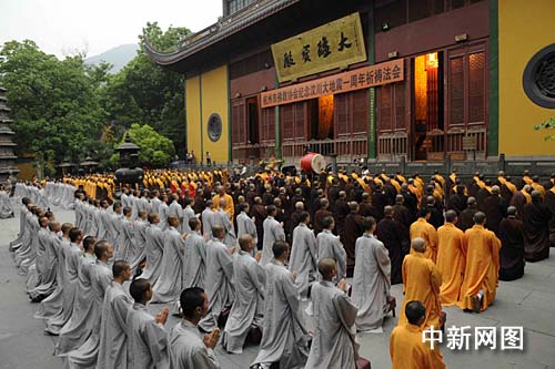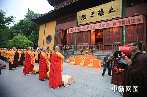 2009年5月12日16时30分,杭州市佛教界各大寺院300余僧众会聚千年古刹灵隐寺,隆重举行汶川大地震一周年祈祷法会。作 者:张望