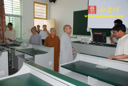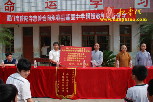 5月21日,遵照会长圣辉大和尚嘱托,正兴法师、定通法师、静仁法师一行驱车来到福建省泉州市永春县蓬壶中学,参加了“厦门南普陀寺慈善会向永春县蓬壶中学捐赠教学设备仪式”,我会为蓬壶中学捐赠了生物实验室一个(实验桌15套)、英语无线教学机10台、英语考试听音设备一套、多媒体投影教学系统二套等教学设备,总价值15.27万元。