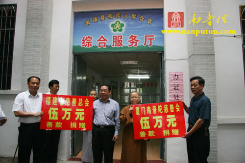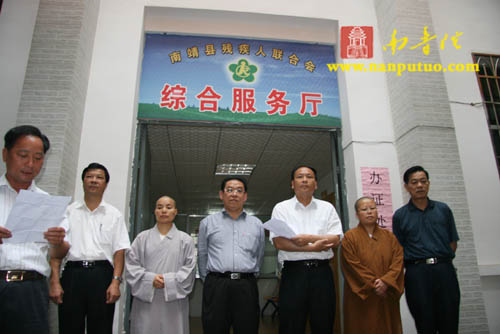 5月19日,受会长圣辉大和尚委托,通灵法师、果瑞法师一行来到福建省南靖县,我会与福建省慈善总会联合助建该县慈善服务中心(即慈善超市)10万元善款。
