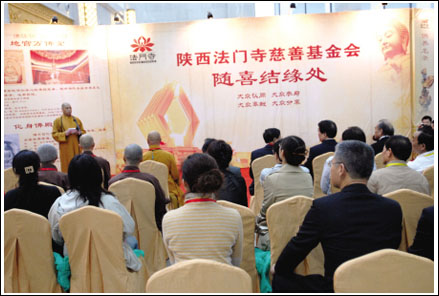 省佛教协会副会长、陕西慈善基金会会长增勤法师向游客、信众介绍了陕西法门寺基金会成立的相关情况,阐述了基金会“维护国家统一和民族团结,贯彻国家宗教政策,弘扬中华传统文化,发扬佛教弘法利生、利乐有情、慈悲救世的精神,支持中国传统文化事业的发展与建设、文化研究和文化交流等项目”的宗旨,充分发挥佛教在构建和谐社会中的积极作用。