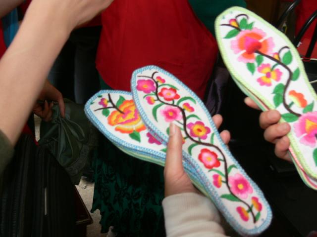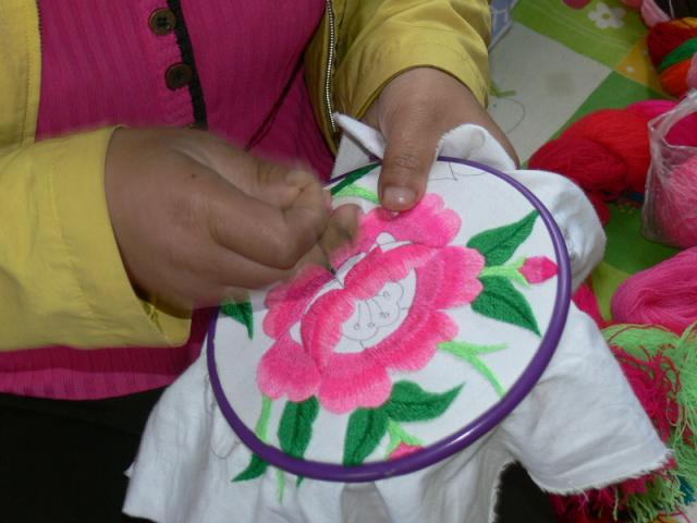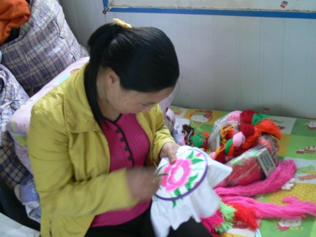 羌族妇女手工的羌绣。她向我们介绍,以前传统的羌绣大家是有分工的,有人负责描图、有人负责刺绣。现在有的人不在了 ,从描图到刺绣全是她自己了 。