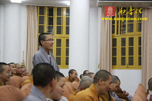 济群法师结合自己多年来的弘法经验阐述了他对人生佛教的思考,并进一步分析了中国传统佛教宗派衰落的原因,从中引导学僧从“皈依、发心、戒律、正见、止观”五个方面进行修学思考。随后法师又从现代佛教低迷状况所引发的社会现象出发,为学僧提出了“僧格的如何养成”、“对解脱的正确认识”、“弘法布教能力的培养”三点意见。接下来,法师还谈及了佛学原理与社会心理学之间关联的弘法机缘。之后,法师对学僧们提出的疑问做了精彩的解答。
