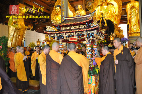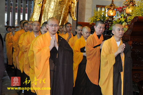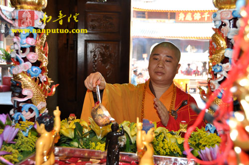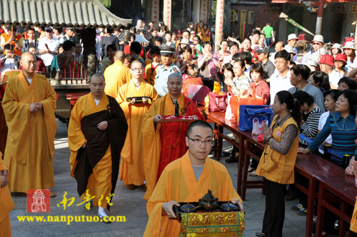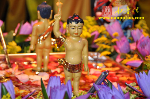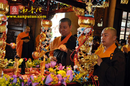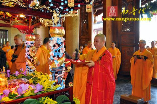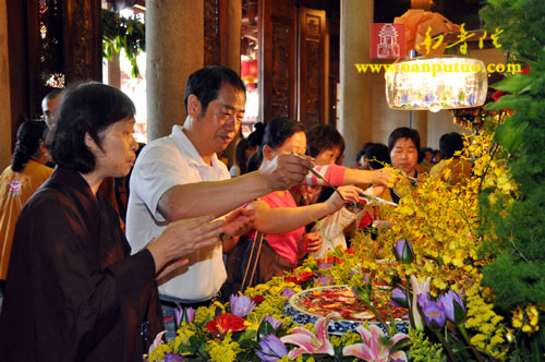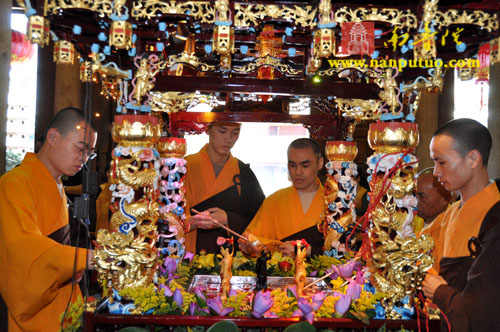 早上7时30分,南普陀寺大雄宝殿,僧众庄严静立,恭候释迦太子圣像请至大殿。时刻一到,钟鼓齐鸣,声震四方,两序仪仗队幢幡高树,我寺方丈则悟大和尚手托太子金像进殿并领众浴佛。拈香礼佛之后,大和尚执持金匙,盛水浴佛。各位法师以及信众依次列队,共浴佛身、同融法会。法会一直持续到中午,参加法会的信众和游客都非常欢喜地圆满了浴佛心愿。
