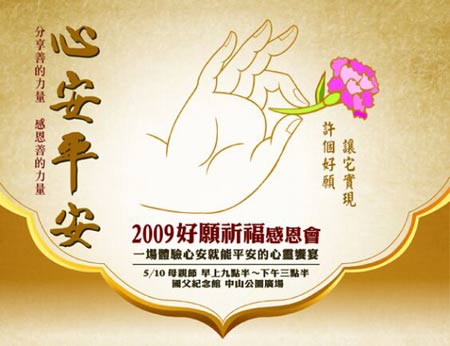 “心安平安─你,就是力量!”启动活动预计在5月10日上午9点30分,在台北市国父纪念馆中山公园广场举办。活动将邀请台湾各界名人共同参与,一起呼吁社会大众响应并发挥创意与愿力,一起分享如何在不同地域、时空为个人、为家庭、为社区、为社会乃至为世界,带来具体而令人感动的力量。