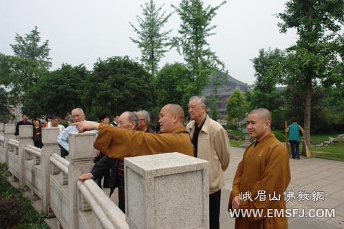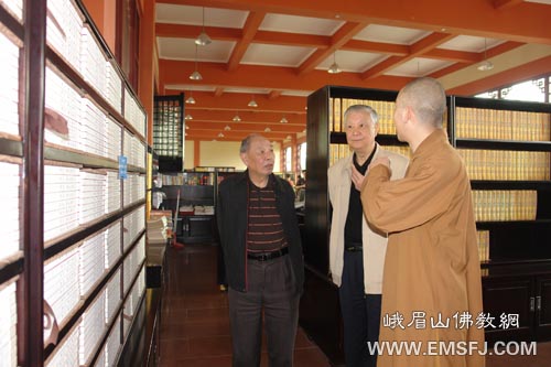 峨眉山佛教协会会长永寿大和尚、大佛禅院知客镇祥法师热情接待,并陪同参观。永寿大和尚向老领导一行详细介绍了大佛禅院整体规划和建设情况,在寺院殿堂:佛教建筑的精美、佛像的庄严都让老领导们惊叹不已;在峨眉山佛教图书馆更被丰富的藏书深深吸引;在参观完四川峨眉山佛学院、峨眉讲堂后,老领导们高兴的说:峨眉山大佛禅院的落成开光,对四川、对整个西部乃至全国佛教人才的培养、佛教文化的弘扬意义重大。