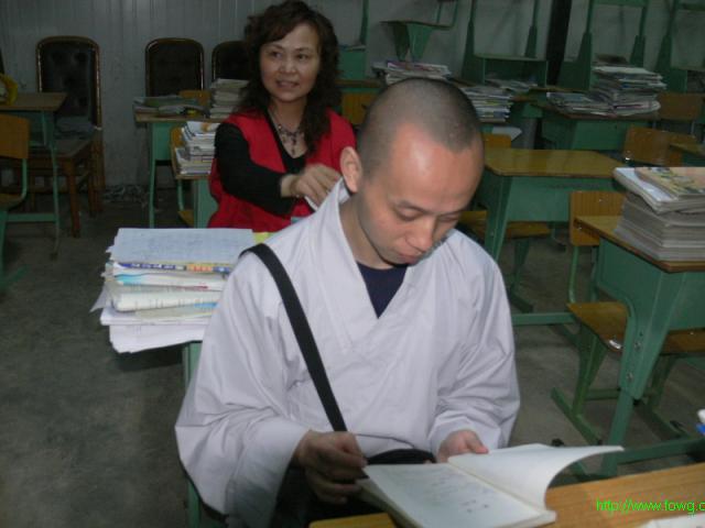 重庆市华岩文教基金会弘真法师与爱心大使们一边等待学生们放学,一边在板房教室内查看学生们的课桌和课本。
