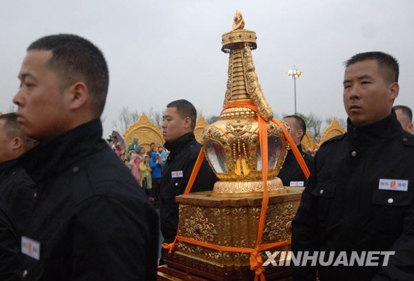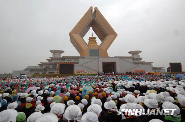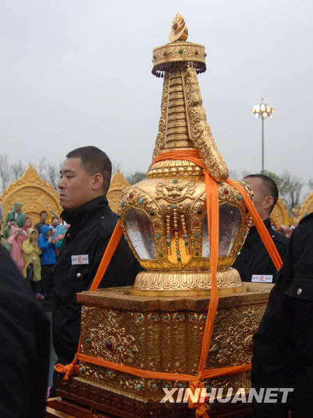 举世仅存的释迦牟尼佛指骨舍利,是我国特级文物,也是世界佛教徒心中的圣物。9日,海内外高僧大德、政要名流及信众3万余人齐聚于法门寺庄严雄伟的合十舍利塔下,参与了盛大的佛指舍利安奉仪式。面对细雨潇潇中恭敬如仪的数万信众,国家宗教局局长叶小文先生充满感情地比喻道:“今天下雨了,这是佛祖他老人家慈悲和喜悦的泪水……”