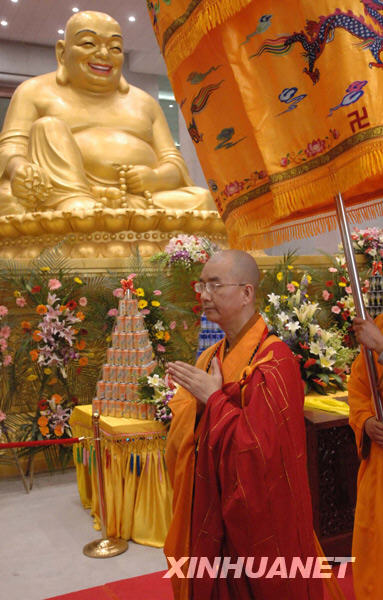 5月9日,法门寺方丈学诚大和尚恭迎佛指舍利。新华社记者丁海涛摄