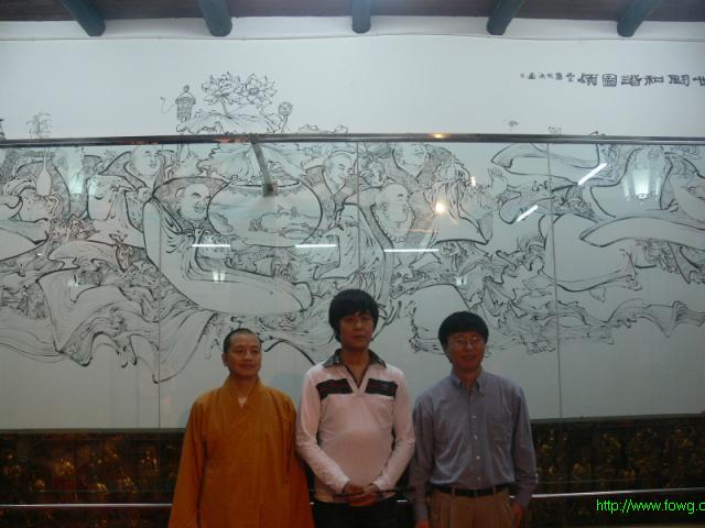 道坚法师、唐天源唐先生、刘庆渝先生于《法喜充满图颂》前合影