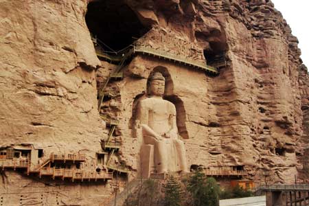 靠岸,下艇,穿过姐妹峰脚底,沿姐妹峰侧支流而进,绕过一道山峦,就进入大寺沟口,便见在石岸陡峰险峻的峰壁上,石窟龛群层层相连,鳞次栉比,栈道凌空,雄伟壮观,大佛背靠石壁,慈祥而坐。摩崖石刻、雕塑彩绘,栩栩如生的显示着中华民族历史文化的悠久和古丝绸之路中外经济文化交流的繁盛。栈道上,游人如织。