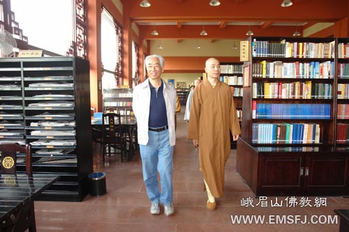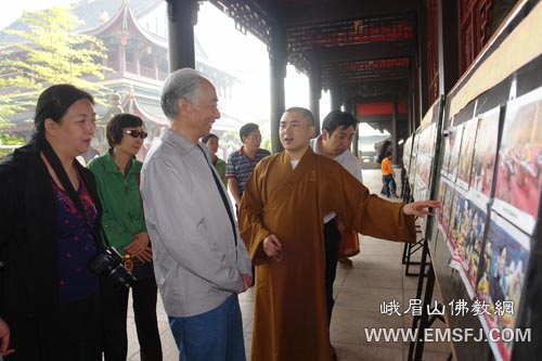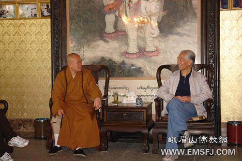 峨眉山大佛禅院监院常性法师、知客镇祥法师等陪同参观。在大佛禅院东花园接待室,永寿大和尚热情接待了汪恕诚老部长一行,并亲切座谈。