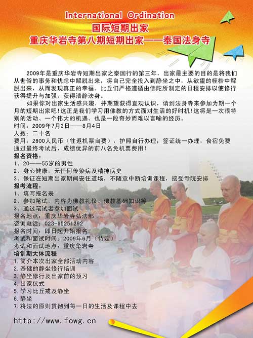 3、保证在短期出家期间安住道场,不随意中断培训课程,接受寺院安排