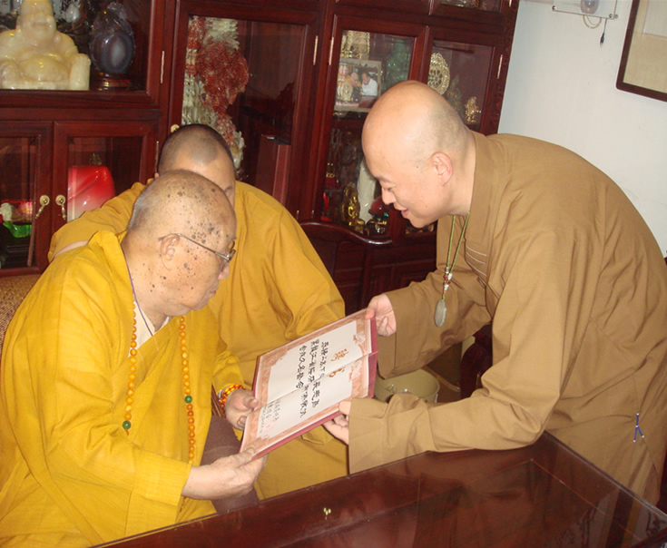 中庸法师代表绥芬河市佛教协会虔诚礼请本焕大长老为黑龙江省绥芬河市佛教协会永久名誉会长。本老欣然接受礼请聘书。