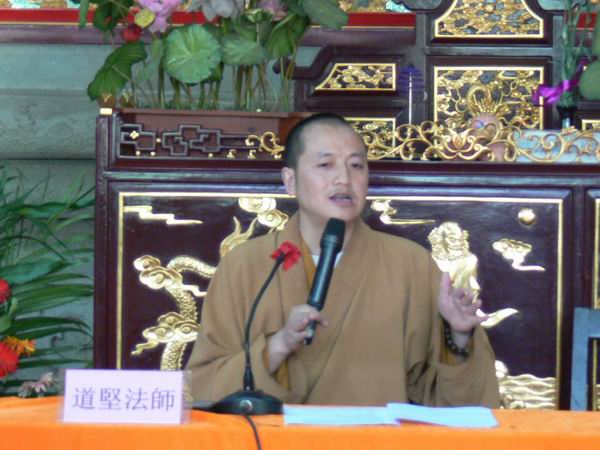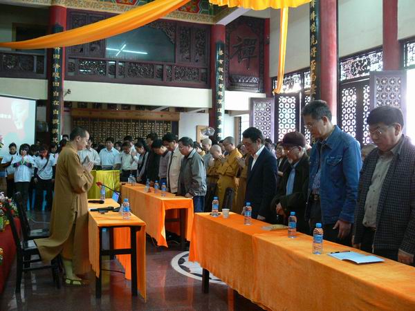 道坚法师首先介绍了在这殊胜喜悦的佛诞日里,华岩寺按照传统举行了如法如律的浴佛节法会,还恢复举行了民间传统的祭祀活动架香及重庆市九龙坡区文化局部分民间传统艺术、国家级非物质文化遗产项目的表演等。接着,道坚法师沉重地介绍今天不但是释迦太子的圣诞,还是5.12四川地震农历一周年的日子,全体人员在道坚法师的提议下,一起起立为地震中死难同胞默哀。