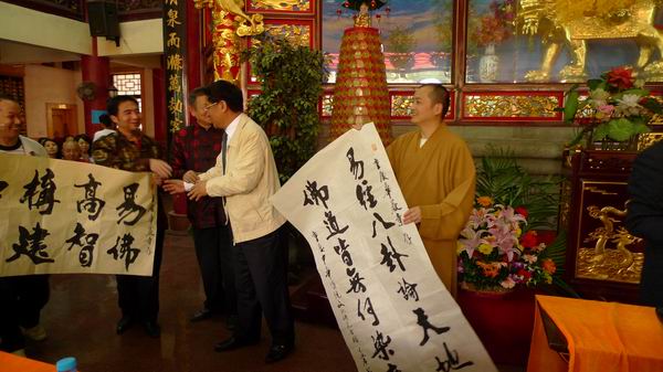 最后,重庆市书法家陈建先生为华岩寺、传统文化研究会赠送书法题字。至此,《佛家哲学思想与构建和谐社会》学术讲座圆满结束。