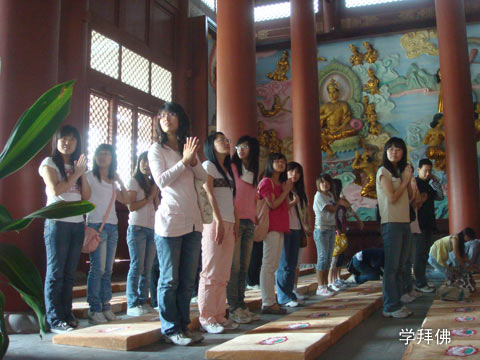同学们首先参观了缘觉殿和大殿,不仅学习了怎样上香修供养,还实地练习了怎样如法礼拜;接着又参观了教室、阅览室和电脑室,教室后墙上所挂的”发心读完大觉书,立愿行尽佛子事“对联,使同学们明白了法师们学习目的和动力竟是如此宏大。中午过斋的时间到了,同学们像法师们一样排队过堂,细心的董老师叮咛同学们一定不能剩饭。饭后当家师思义法师在禅堂与同学们座谈。同学们提了不少问题,有问佛教如何与当今时代适应的,有问佛法的精髓是什么,如何调心静坐的。思义法师都一一给予耐心善巧解答。