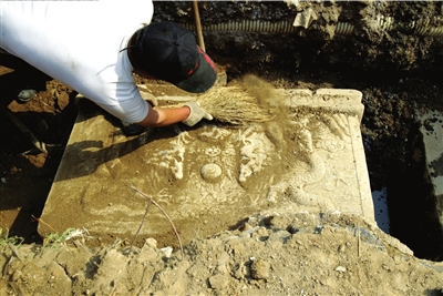 5月5日下午,记者看到,这块碑呈白色,上面满是泥土,距离地面1.5米左右。碑身长2.8米左右、宽1.2米左右,厚约20厘米。石碑表面已全部露出,碑身上的碑文清晰可见。