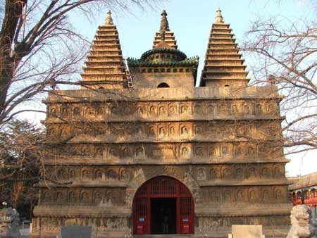 银杏之北,风景迥然不同:一座金刚宝座塔顶天立地,昂然伫立眼前。站在塔下仰望,能看见宝座之上还有数塔,形制颇似香山碧云寺的金刚宝座塔。那里的讲解员告诉我,这座塔的下层为宝座,高7.7米,最下层是高1.78米的须弥座,上层另有5座塔。在宝座的四周,刻有梵文、佛像等。须弥座至宝座顶分成了5层,每层挑出石刻短檐,四周刻有佛龛。讲解员告诉我,除了宝座内的4尊佛像外,宝塔还刻有1561尊佛。沿宝座南门内右侧盘梯上去,就到了宝座顶的罩亭内。罩亭北边,是一个台面,5座塔便立于此。