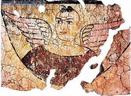 在新疆若羌县米兰佛寺出土的米兰壁画,为4世纪鄯善国时期的佛教遗迹,保存较好的壁画有释迦牟尼与6弟子像,具有浓郁的希腊艺术风格。尤其是“有翼天使”画,共出土7幅,画面上呈现的是长有双翼的青少年男子形象。据研究,他们都是佛教中的香神,也就是音乐之神。在印度本土,他们身上没有翅膀。米兰有翼天使的形象显然是从希腊罗马艺术中的天使嫁接而来,可以说就是希腊神话中爱神的翻版。