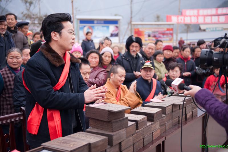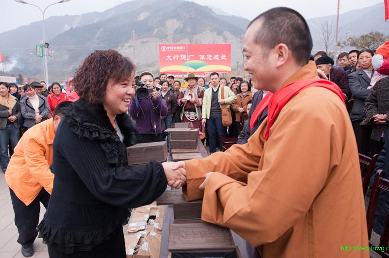 北川县赵副县长表示感谢的发言,我们觉得授之有愧。台上为川马公司总经理陈居士,华岩寺方丈道坚法师、中国民间医药博物馆刘光瑞馆长,重庆市红十字会常务副会长周女士等。