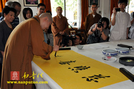 南普陀寺方丈则悟法师在活动的最初开笔,借助“慈悲喜舍”四个大字,道出了本次活动的宗旨和真义,赢得了在场所有人的热烈掌声。则悟法师表示:各位书法家在千年古刹南普陀聚会,以佛法与书法为契机,向灾区人民表达关爱,做有益人民的事,就是在行善,希望此善举能引起社会各界的响应。之后,诸位书法家纷纷提笔,同表爱心、共襄盛举。