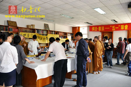 2009年5月1日上午9时许,福建省厦门市南普陀寺在闽南佛学院教务处举办“佛法·书法 ——‘五一’笔会”活动,邀请厦门市书画协会陈秀卿会长及近30名书法家亲临现场挥毫泼墨,南普陀寺多位法师及闽院学僧到场观摩学习。本次活动的书法作品将捐赠予2008年“5.12”地震的灾区人民,以佛法和书法为媒介,表达大家对灾区人民的关怀和爱心。